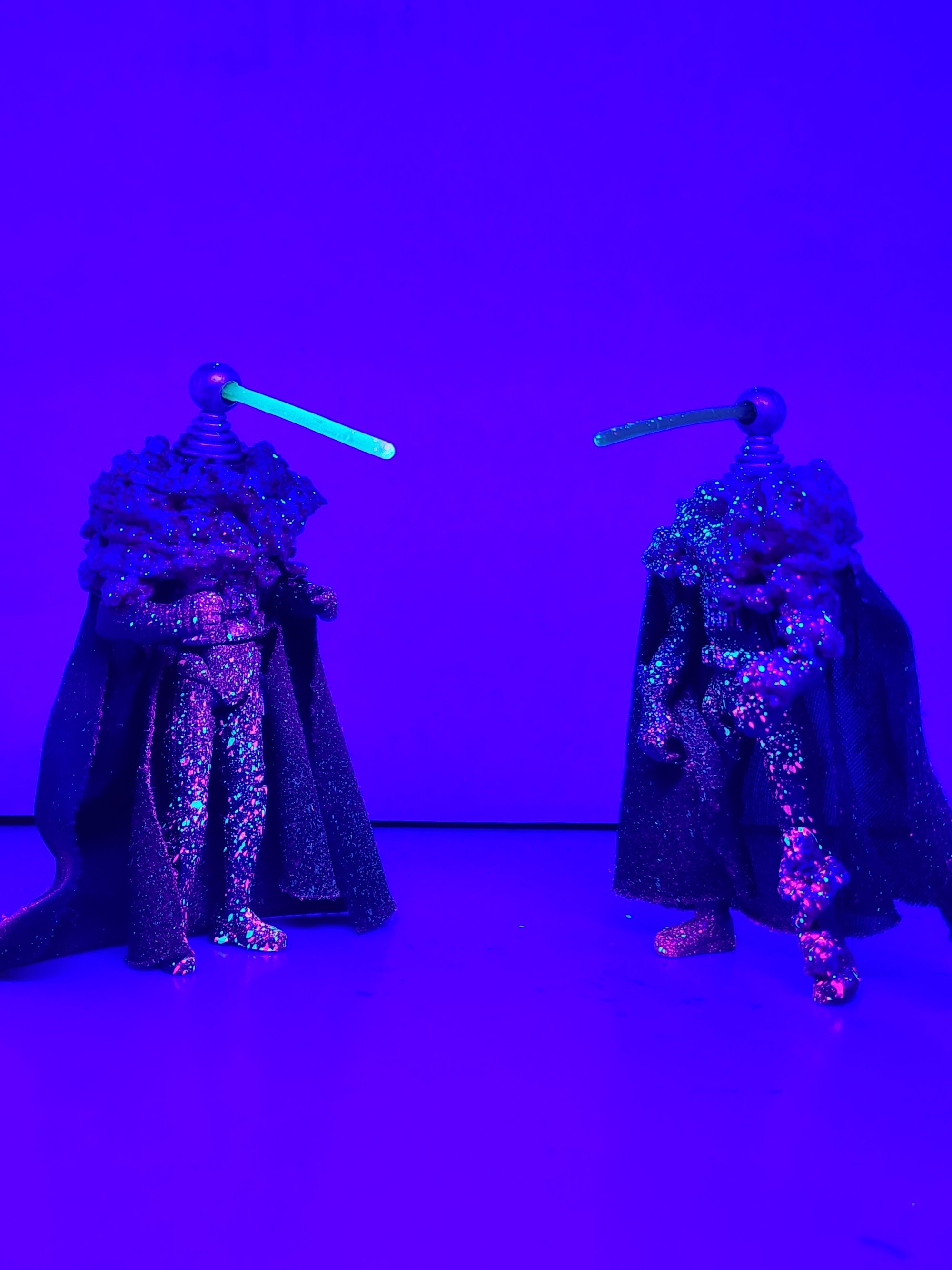 Hand painted and spray painted details. Blacklight glow effects. Orders filled randomly with one of two available figures.