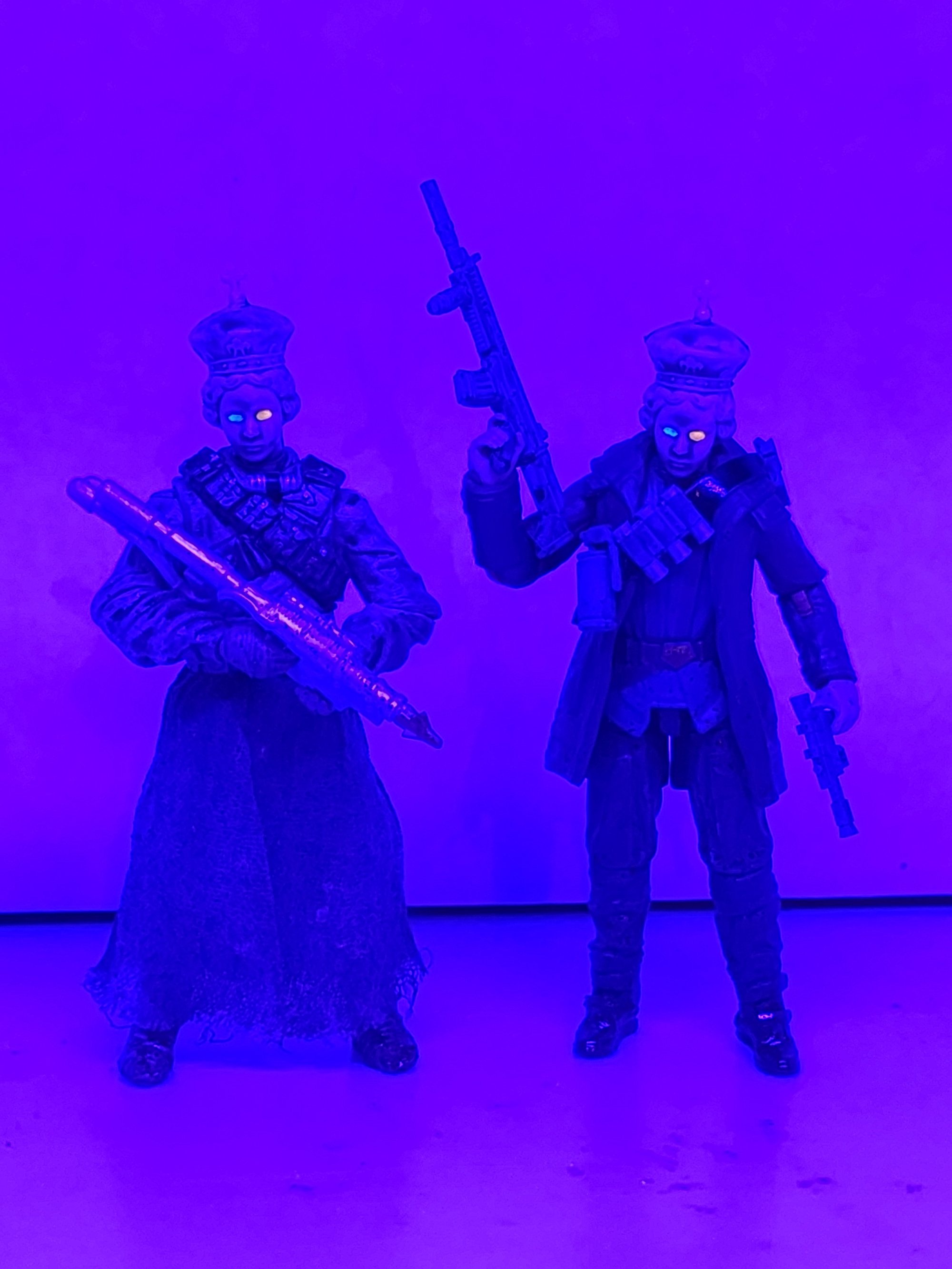 Hand painted and spray painted details. Each figure comes with depicted accessories. Blacklight glow eyes.
